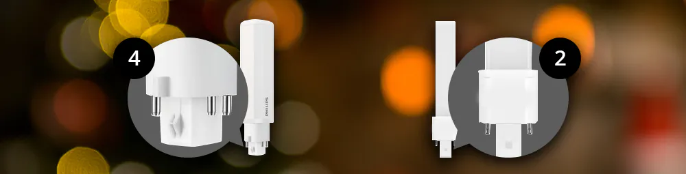 Bij (LED) spaarlampen bestaan er fittingen/lampvoeten met 2 pinnen of 4 pinnen. Kies altijd een spaarlamp met dezelfde lampvoet, anders past deze niet in het armatuur en werkt deze niet. Spaarlampen met een 2-pins fitting werken met een conventioneel voorschakelapparaat (EM) incl. starter. Spaarlampen met een 4-pins fitting werken met een elektronisch voorschakelapparaat (HF) zonder starter.